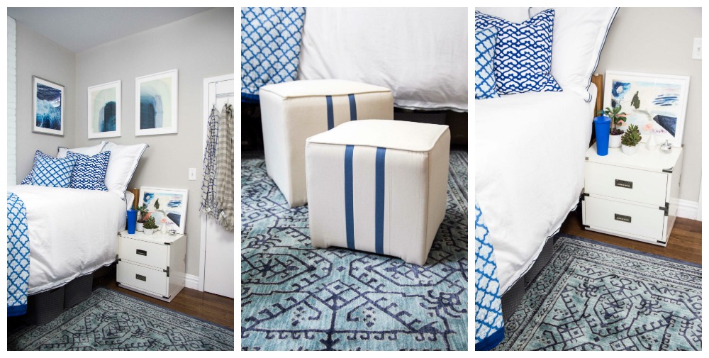 First up, a blue and white room for my friend Colesy. This room is actually a double, so I went with an 8×10 size that would cover the entire room. This way, both Colesy and her roommate can enjoy the new rug, and the room feels more cohesive with this underlying design element. This room featured the incredible Cascade Heights Barrow BLUE AREA RUG from Mowhawk Home – and it really pops in the room! It’s super soft underfoot and really ties the whole space together. I paired it with a set of two cute nesting ottomans which are perfect for pulling out extra seating when friends come over! With whole space is washed in blue, and I know it will be both a relaxing retreat and fun entertaining space that Colesy will be excited to come home to.