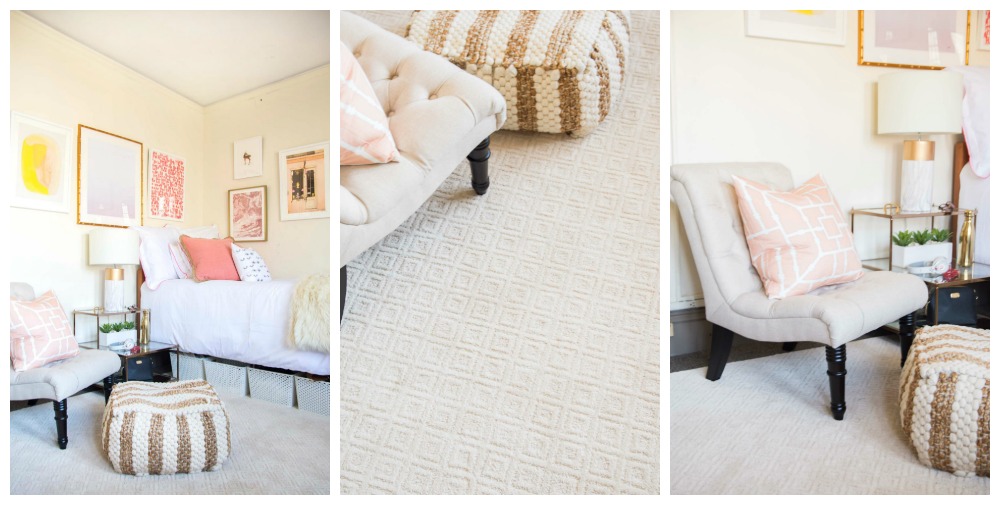 Next, a ‘lush blush’ single dorm room for my friend Olivia. She wanted a warmer pink and gold color scheme in her room, and I channeled the buzz-worthy millennial pink trend in the design. Her room was in an older dorm and dark grey carpet definitely didn’t fit the new color palette. Her new PARAGON AREA RUG rug was a huge game-changer in the space since it provides a light, neutral ground for the room. I usually shy away from white rugs but Mohawk’s Smartstrand material which is durable, stain-resistant, and super soft lets me get away with the light color! The subtle pattern reminds me of a Greek key and adds some texture underfoot.